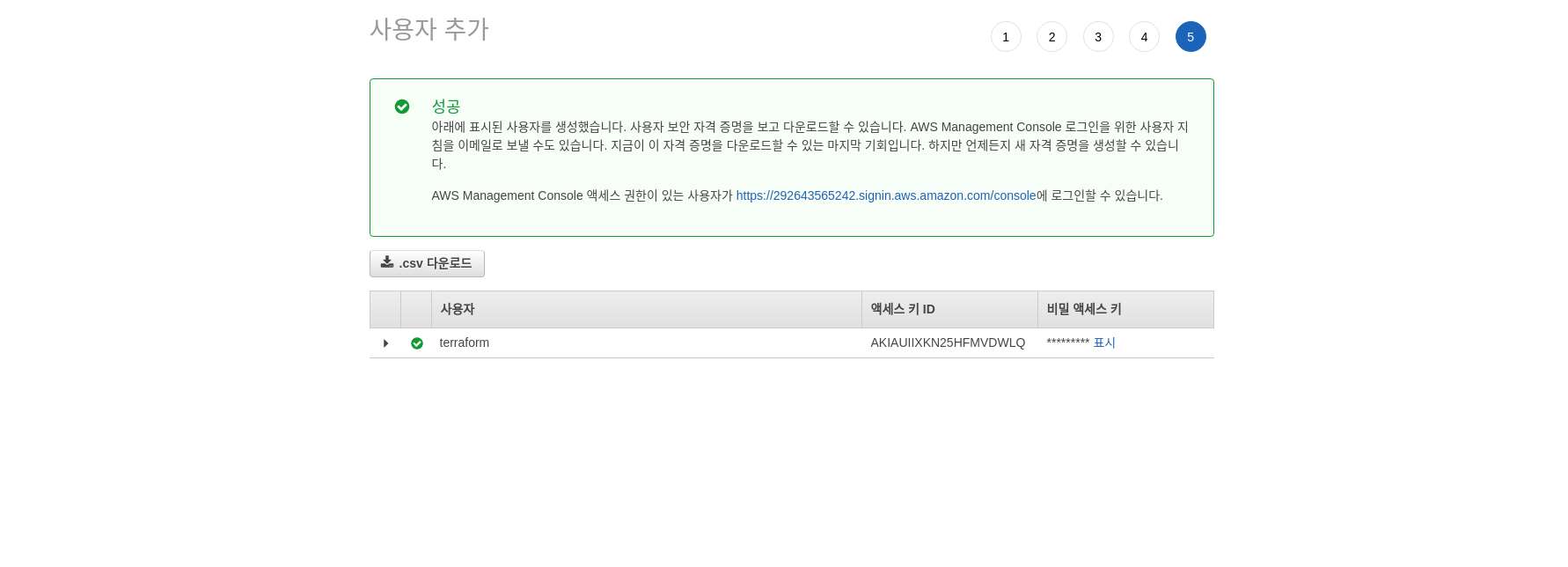 5. 다음 계속 누른후 마지막에 엑세스키ID, 비밀엑세스키 따로 메모해놓기