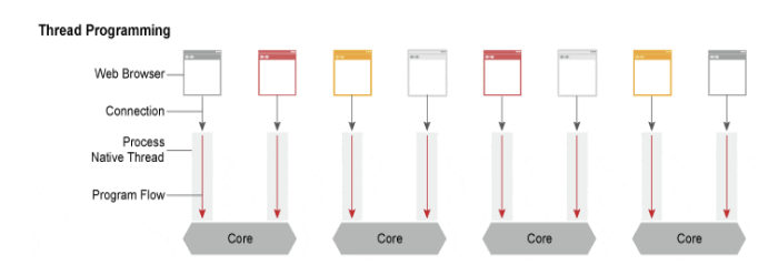 - 스레드 / 프로세스 기반 구조 : 클라이언트 요청 하나당 스레드 하나가 처리하는 구조