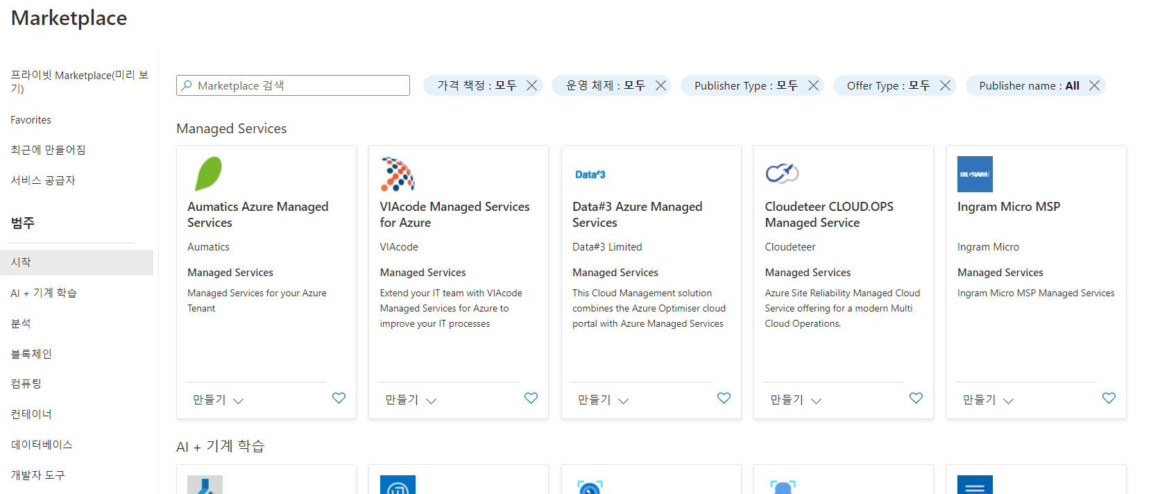 마켓플레이스에서 윈도우 서버를 포함해 다양한 운영체제 이미지와 MS가 제공하는 공식 이미지를 사용할 수 있다.