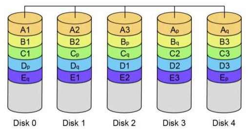 RAID-Z(RAID-5)의 경우 세 개 이상의 디스크에 데이터와 패리티 비트를 저장하는 구조이며 보통은 5 개 이상의 디스크를 사용합니다. 데이터별로 1 개의 패티리 비트를 사용하여 추후 디스크의 데이터 손실 시 복구용으로 사용합니다.