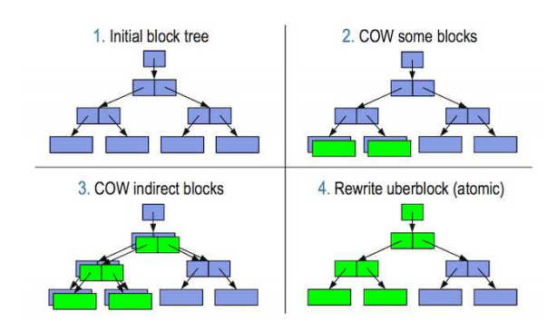 기존 UFS 파일 시스템의 파일 수정 방식은 제자리에서 파일을 덮어쓰는 형식으로 진행되며, 데이터 블록이 할당되는 시간에 장애가 발생되면 데이터에 오류가 발생하고 포인팅 정보를 잃어버리게 되어 파일이 손상됩니다. 이 문제를 해결하기 위해 ‘fsck’ 명령어 사용하여 더티 블록을 찾아 정보를 재 연결하거나 복구하는데 다운타임이 발생합니다. 최근의 파일 시스템은 저널링 혹은 로깅 기능을 이용하여 분리된 저널을 찾아 복구할 수 있도록 하지만 불필요한 I/O 가 발생합니다. 이러한 현상을 방지하기 위하여 ZFS 에선 COW 트랜젝션 방식을 이용하여 파일을 수정하며, 일반적인 COW 트랜잭션과는 약간 다르게 사용합니다. ZFS 에서 사용하는 COW 트랜잭션은 사용중인 데이터를 가진 블록을 덮어쓰지 않고 별도의 다른 블록에 먼저 작성한 그림 3. COW 트랜잭션 진행 순서 15 뒤 변경 작업이 완료되면 포인터를 새로 쓰여진 블록으로 변경하여 저장합니다. 그렇게하면 기존의 변경 전 데이터는 파괴되지 않고 그대로 사용이 가능하며, 기존 데이터 복구가 가능합니다. 이 작업은 파일 시스템의 최상위의 단일 디스크 블록인 ubuerblock 에서 이루어지며, 이를 통해 예기지 않은 장애가 발생하더라도 데이터 손상이 없게 됩니다.