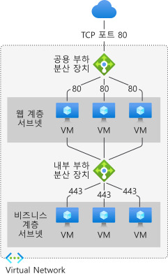 내부(또는 개인) 부하 분산 장치 는 사설 IP가 프런트 엔드에서만 필요한 경우에 사용됩니다. 내부 부하 분산 장치는 트래픽 부하를 가상 네트워크 내에 분산하는 데 사용됩니다. 하이브리드 시나리오의 온-프레미스 네트워크에서 부하 분산 장치 프런트 엔드에 액세스할 수 있습니다.