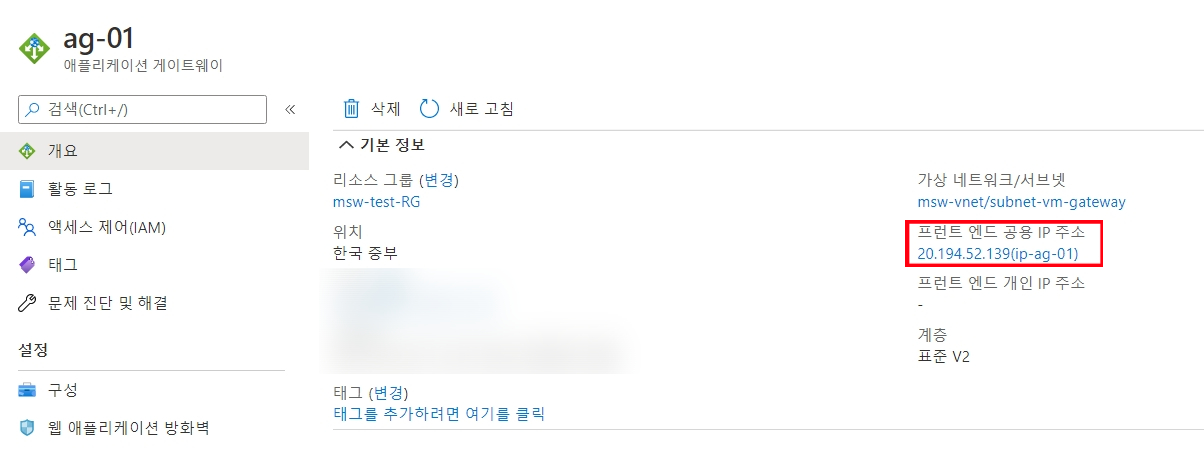 어플리케이션 게이트웨이는 공용IP주소(필수)와 개인IP주소(선택)을 할당할 수 있지만 개인 IP 주소 단독으로 할당 할 수 없다. 어플리케이션 게이트웨이, 가상네트워크, 공용 IP 주소는 동일한 위치여야 한다.