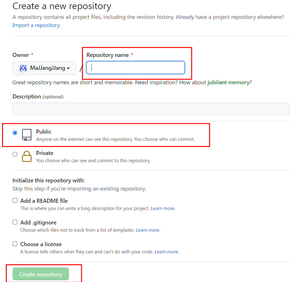 원격저장소 이름을 적고 Public 으로 설정 그리고 생성한다.