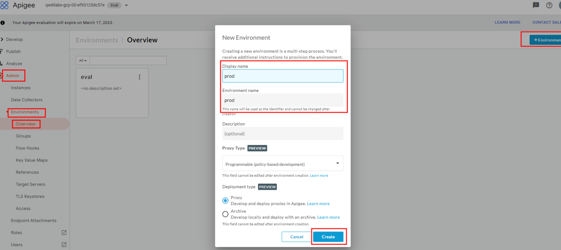 ‘Deploy to: eval’ 클릭 후 eval, prod 환경에 배포