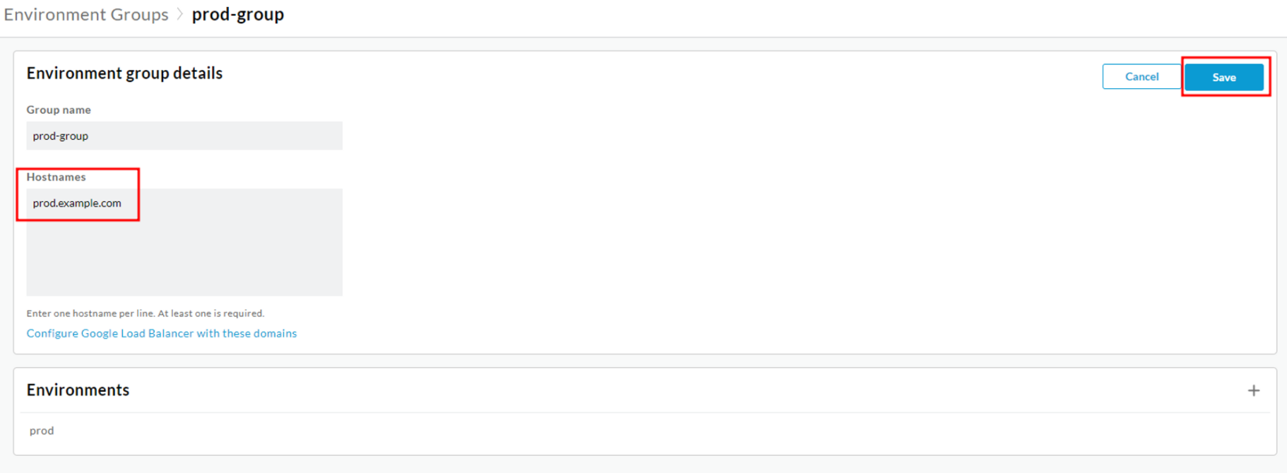 - Apigee X 조직에 두 번째 환경 그룹을 추가하여 환경 및 호스트 이름 할당