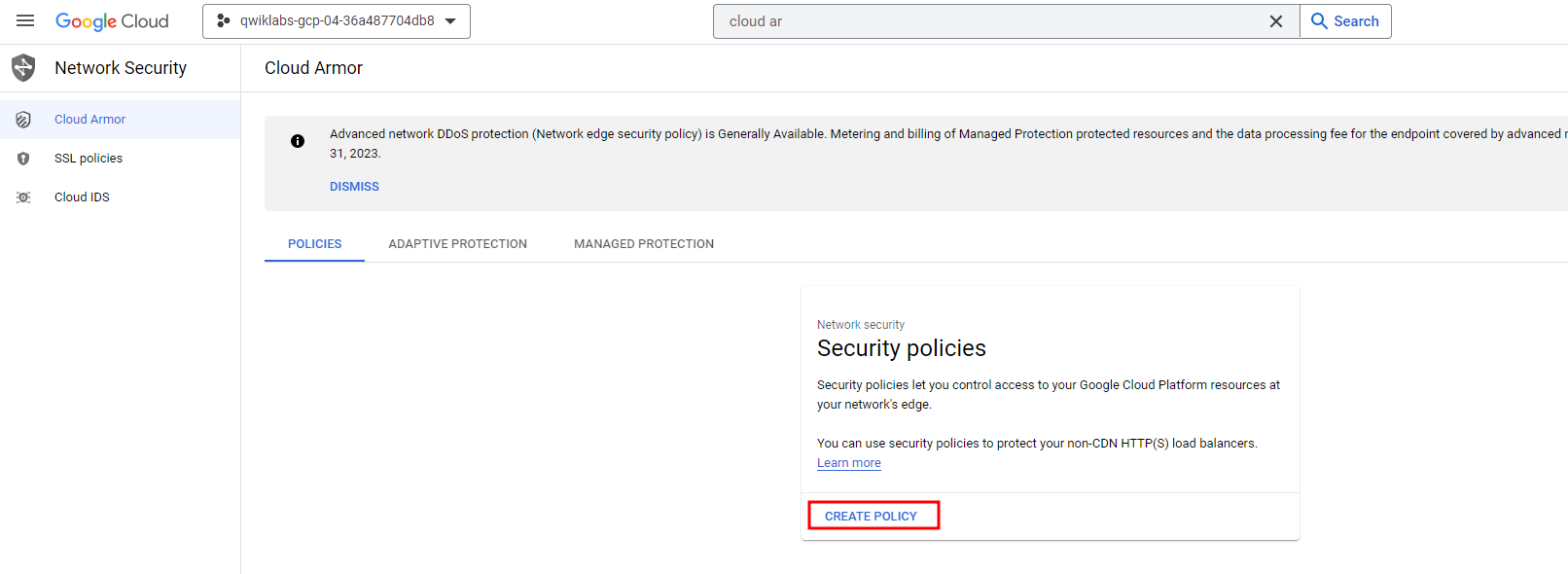 GCP Project에서 Network Security - Cloud Armor 이동 후 'Create Policy'