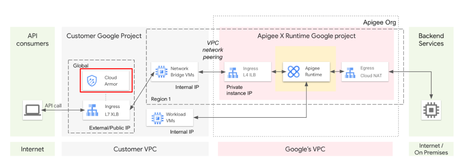 Google Cloud의 웹 애플리케이션 방화벽입니다. 부하 분산기에 단일 Cloud Armor 정책을 지정할 수 있습니다. 이 실습에서는 Cloud Armor 보안 정책을 사용하여 특정 트래픽이 Apigee 런타임 인스턴스에 도달하기 전에 거부하여 API를 보호합니다.