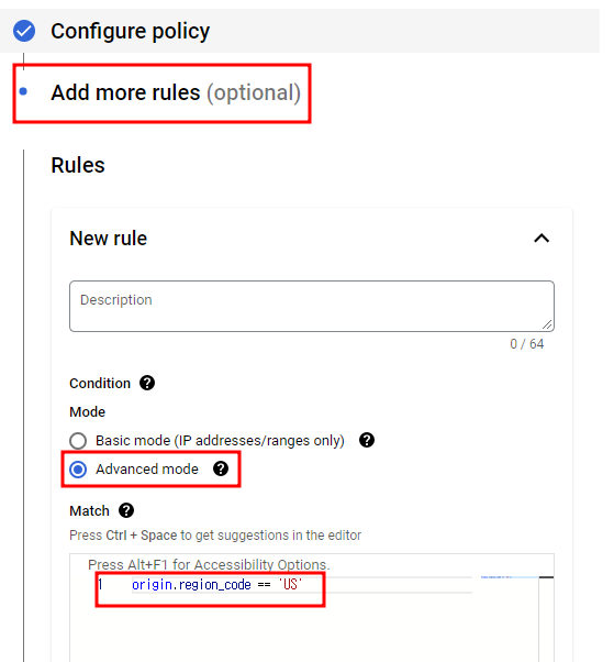 Advanced mode 활성화 후 US에서 들어온 트래픽만 허용하도록 설정한다.