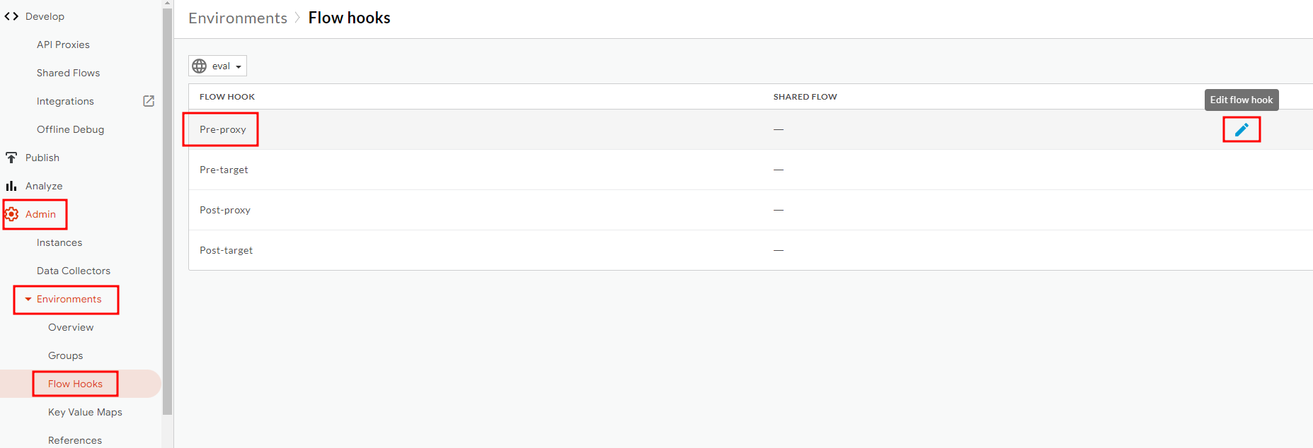 Admin - Environments - Flow hooks 이동 후 'Pre-proxy' 편