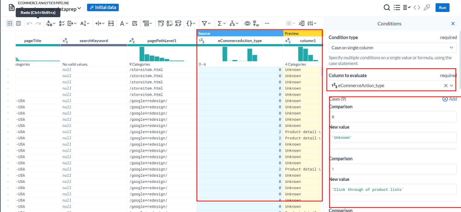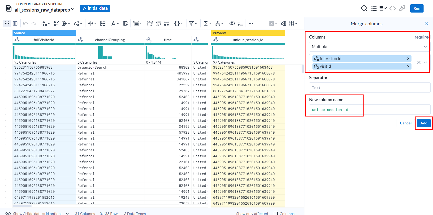 소스 데이터세트에 중복된 세션 값이 포함되어 있을 수 있다는 경우에 중복제거를 통해 수정하도록 하겠습니다.