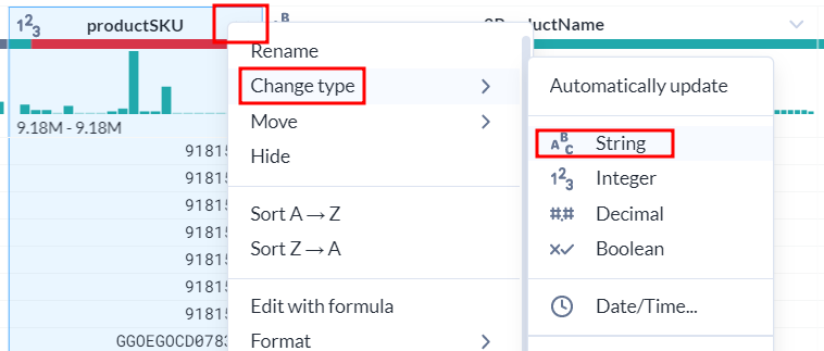 productSKU 열 데이터 유형 변환