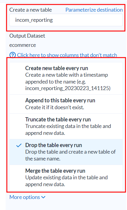 생성할 테이블 이름 정의 후 이후 dataset은 어떻게 할건지 선택