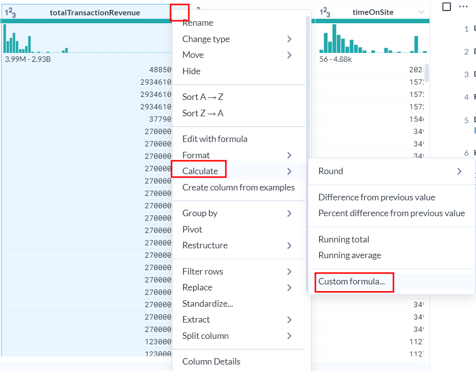 totalTransactionRevenue Column처럼 숫자를 다시 계산해서 표현할 수 있습니다.