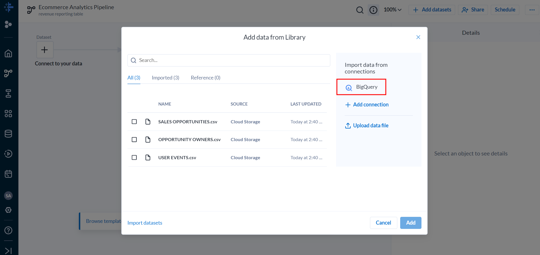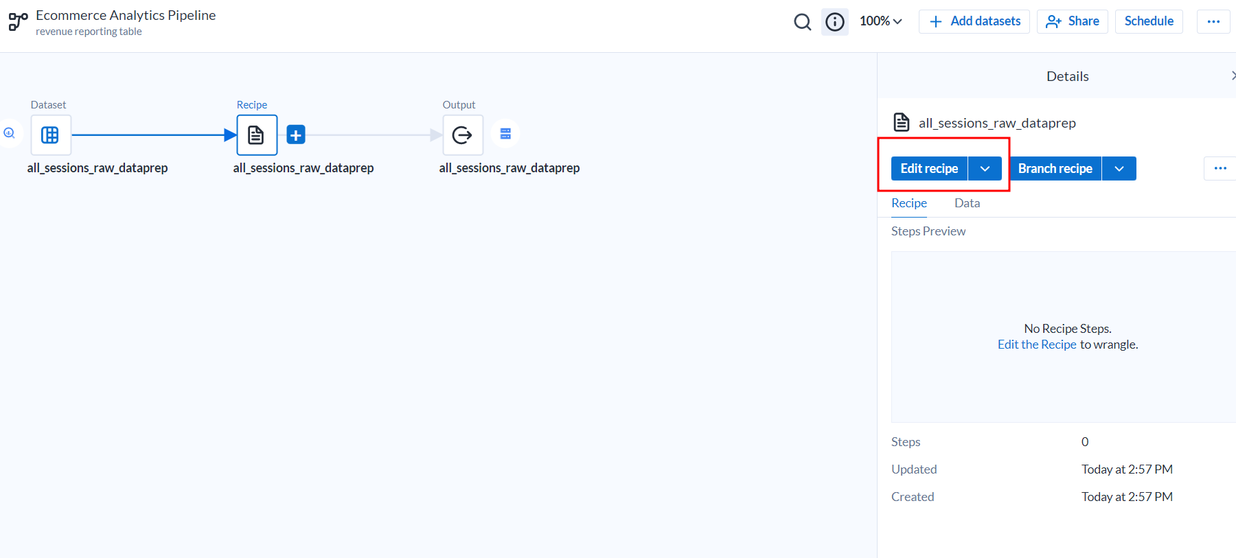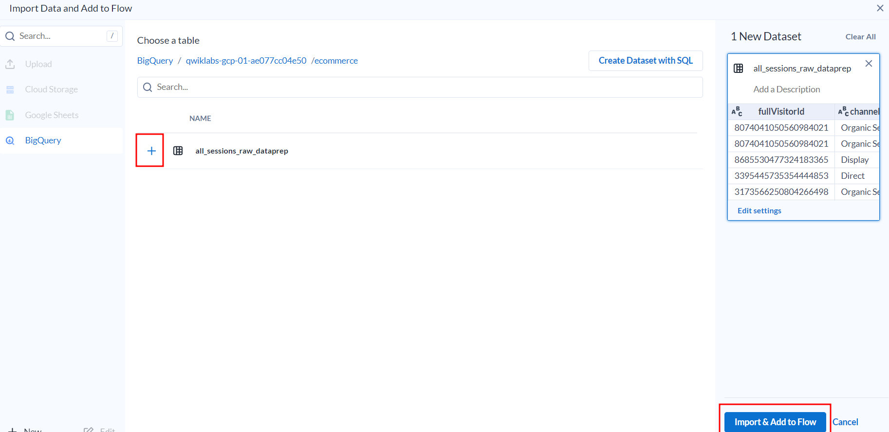 - BigQuery 데이터세트를 Cloud Dataprep에 연결합니다.