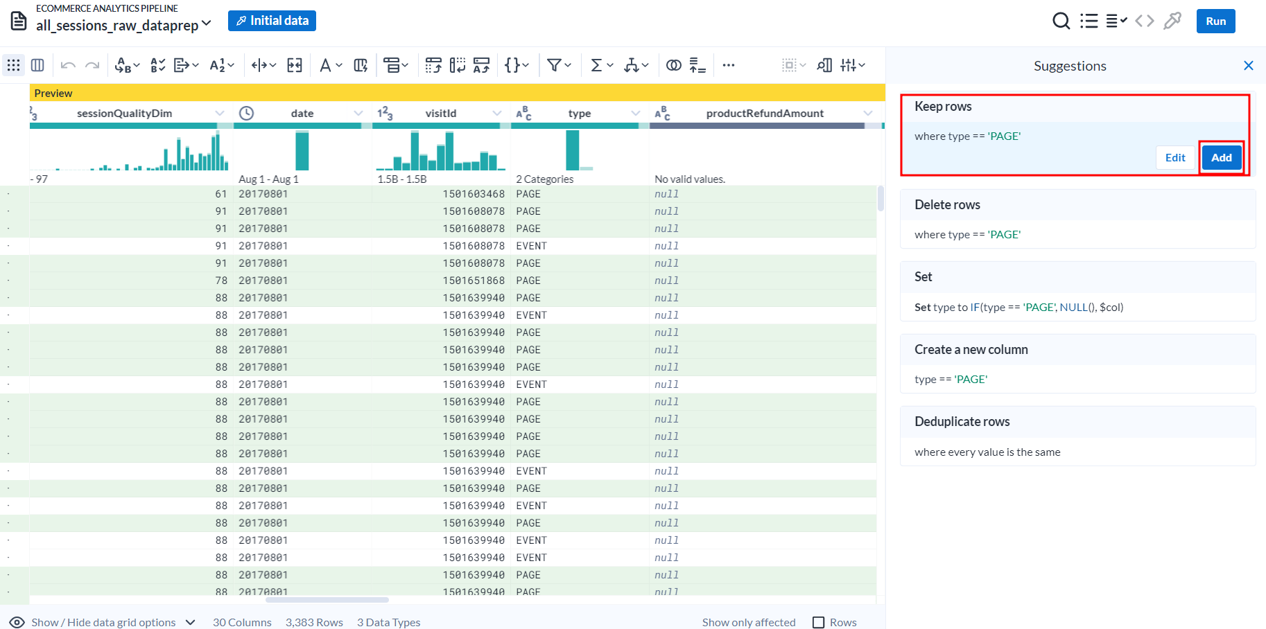 데이터 세트에는 PAGE (페이지 보기용) 또는 EVENT ("제품 카테고리 보기" 또는 "장바구니에 추가됨"과 같은 트리거된 이벤트용)와 같은 다양한 유형의 세션이 포함됩니다. 세션 페이지뷰를 이중으로 계산하지 않으려면 페이지뷰 관련 히트만 포함하도록 필터를 추가