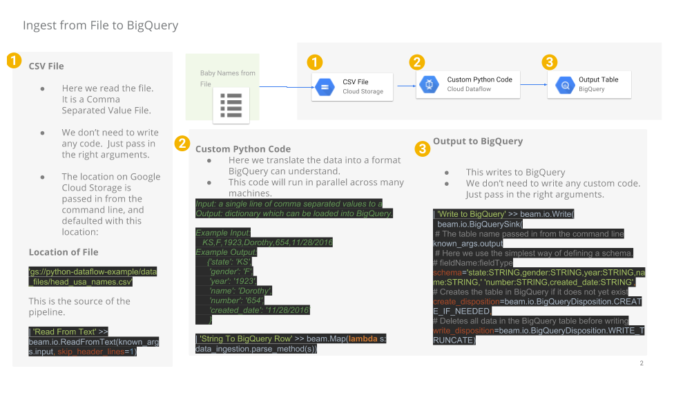 이제 TextIO 소스와 BigQueryIO 대상이 있는 Dataflow 파이프라인을 빌드하여 데이터를 BigQuery로 수집합니다. 보다 구체적으로 다음을 수행합니다.