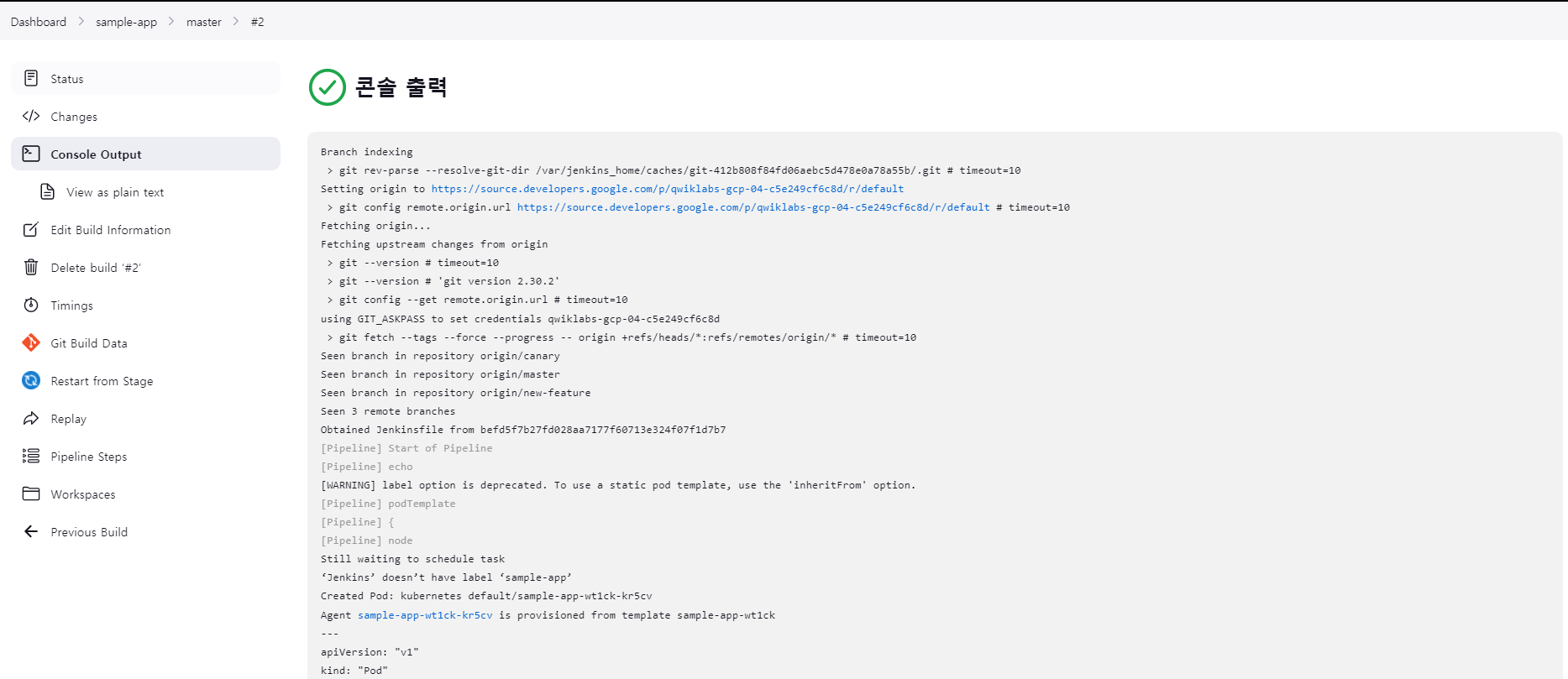 좌측 빌드상태에서 Console Output으로 현재 상황을 확인할 수 있